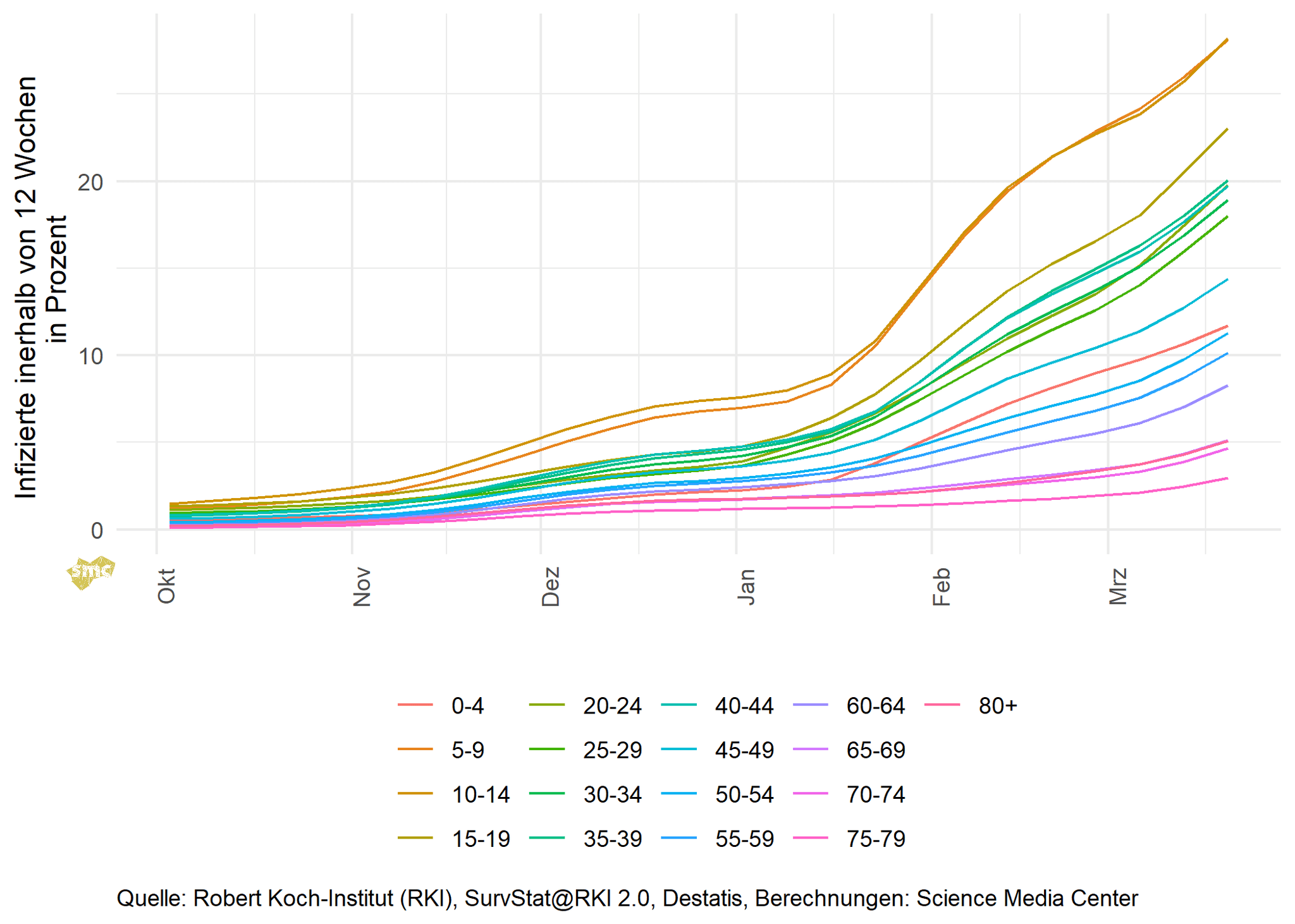 Da die geplanten Lockerungen in vielen Bundesländern auf Anfang April verschoben wurden, stellt sich die Frage, wie sich die epidemiologische Lage im April entwickeln wird. Da die Zahl der Infektionen stark vom Verhalten der Bevölkerung abhängt, ist eine genaue Prognose nicht möglich. Mit verschiedenen Annahmen lässt sich allerdings abschätzen, welche Szenarien plausibel und welche unplausibel erscheinen. Best Case Szenarien lassen sich nur schwer definieren, da insbesondere die Höhe der Dunkelziffer und der Einfluss des Frühlingsanfangs schwer abzuschätzen ist. Bei den worst case Szenarien lässt sich etwas mehr aussagen. Unter der Annahme, dass Reinfektionen in einem überschaubaren Zeitraum von 12 Wochen eher die Ausnahme sind, kann man die Zahl der potenziell infizierbaren Menschen abschätzen. Bei einer geschätzten Dunkelziffer, die im Schnitt eben so hoch ist wie die gemeldeten Fälle, sind bei den Schulkindern in den vergangenen 12 Wochen bis zum Anfang dieser Woche etwa 55 Prozent infiziert gewesen, in den mittleren Altersgruppe sind es fast 40 Prozent. Inklusive angenommener Dunkelziffer infizieren sich in diesen Altersgruppen etwa 5 Prozent der Bevölkerung pro Woche. Unter Fortschreibung dieser Zahlen hätten zum Zeitpunkt der Lockerungen Anfang April etwa 65 Prozent der Schulkinder und etwa 50 Prozent der mittleren Altersgruppen eine Infektion erst kürzlich durchgemacht. Mit diesen Zahlen im Hinterkopf erscheint es plausibel, dass schon eine Verdopplung der wöchentlichen Infektionen über einen längeren Zeitraum eher unwahrscheinlich ist, denn schon zwei Wochen mit einer doppelt so hohen Inzidenz würden zu 20 Prozentpunkten zusätzlichen Infektionen in den Altersgruppen führen. Da erfahrungsgemäß Infektionswellen nicht abrupt abbrechen, sondern auslaufen, wären insbesondere bei Schulkindern in so einem Szenario kaum noch ausreichend ansteckbare Personen übrig. Ein Anstieg der Zahl der Infektionen in den kommenden Wochen ist also möglich, eine längere Verdopplung aber eher unwahrscheinlich.