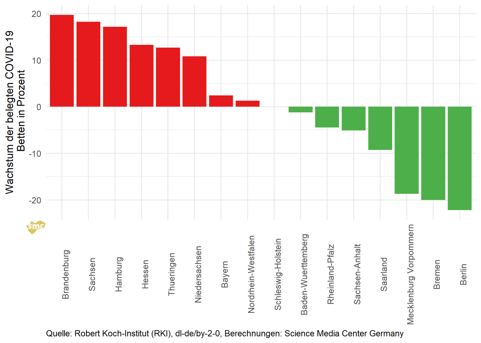 Der Trend der Belegung auf den Intensivstationen ist für die meisten Bundesländer steigend. Hohes Wachstum verzeichnen aktuell nur kleine Bundesländer.