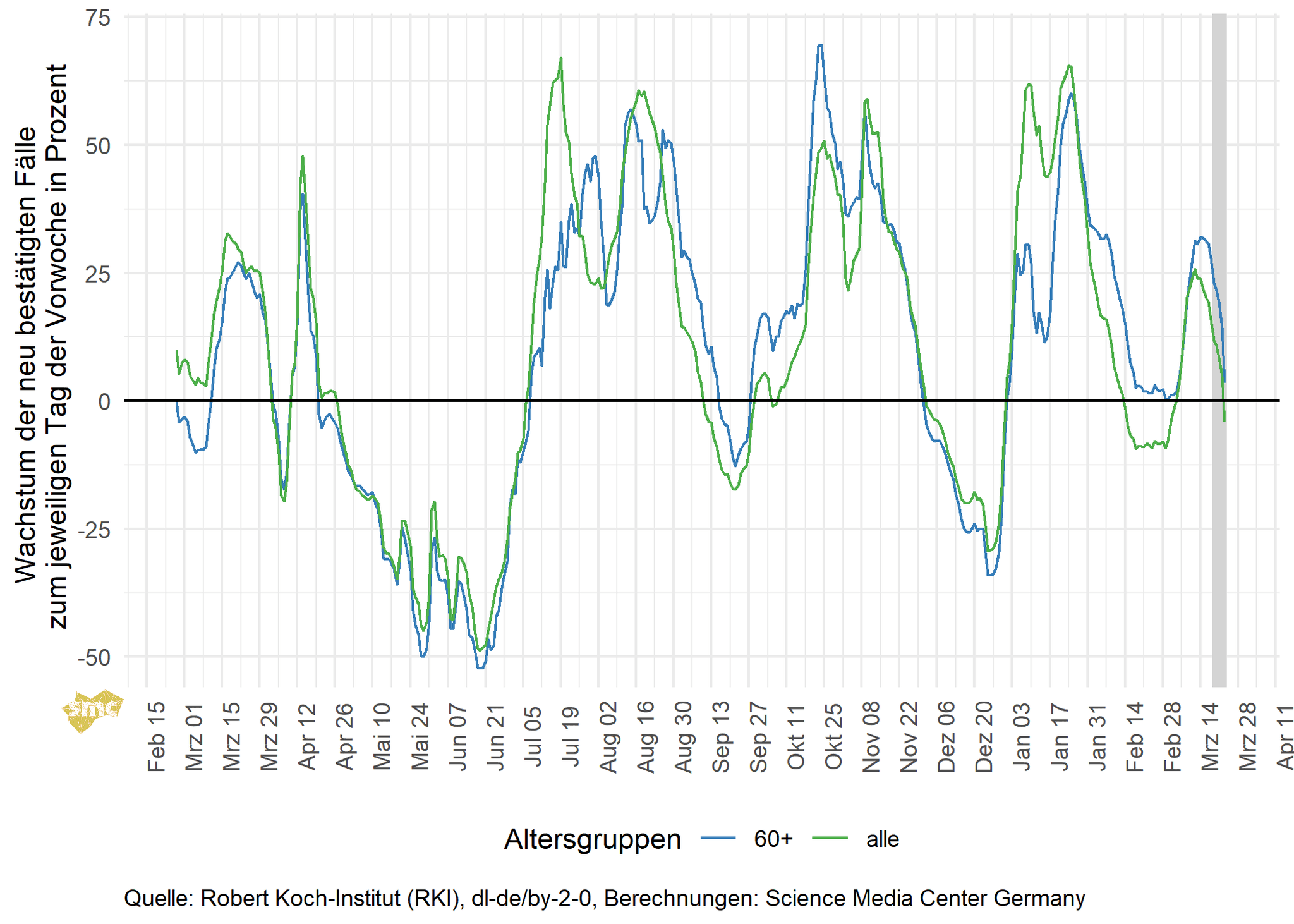 Die Grafik zeigt für jeden Tag das prozentuale Wachstum der geglätteten Fallzahlen im Vergleich zur Vorwoche. Dabei werden einmal alle gemeldeten Fälle berücksichtigt und einmal nur Fälle mit einem Alter von mindestens 60 Jahren. Das Wachstum in der Altersgruppe ab 60 Jahren ist aktuell wieder größer als das Gesamtwachstum. Das aktuelle Absinken des Wachstums kann auch in Zusammenhang zu den begrenzten Kapazitäten in den Laboren stehen.