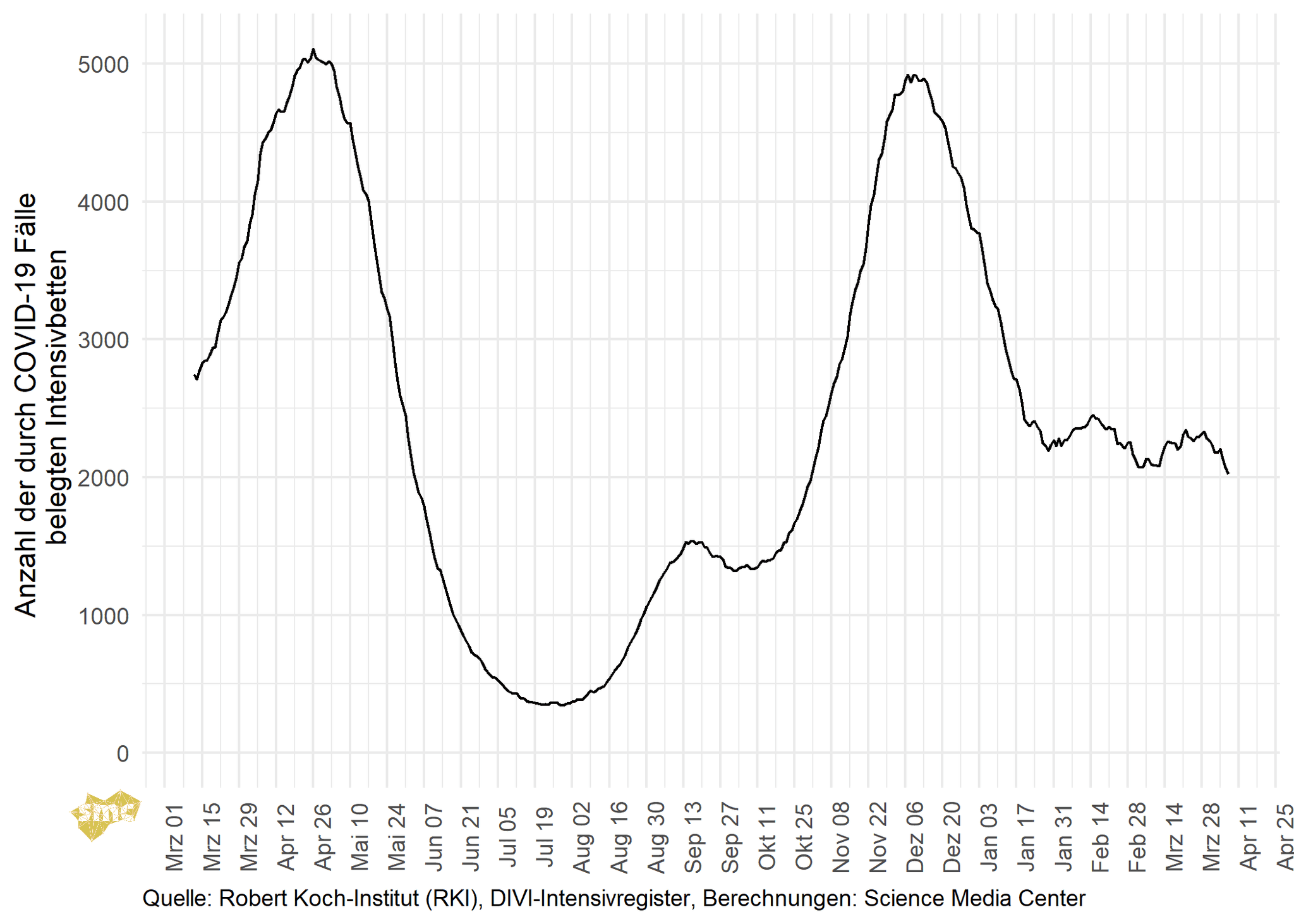 Die Inzidenz, berechnet aufgrund der gemeldeten Fälle, ging in dieser Woche deutlich zurück. Ein Teil dieses Rückgangs lässt sich durch ein geändertes Testverhalten erklären. Laut ALM e.V. wurden in der vergangenen Woche im Vergleich zur Vorwoche 16 Prozent weniger PCR-Tests durchgeführt. Da auch die Testpositivrate von 56,0 Prozent auf 52,6 Prozent leicht gesunken ist, ist aber nicht plausibel, dass der Rückgang allein durch die geringere Zahl der durchgeführten Tests zurückzuführen ist. Auch die Maßzahlen aus dem Gesundheitswesen wie der Nowcast der Hospitalisierungsinzidenz und die Bettenbelegung auf der Intensivstation deuten weiterhin auf einen Rückgang der Fallzahlen hin. Ob die Lockerungen von Anfang der Woche den Trend noch einmal umdrehen können, wird sich in der kommenden Woche zeigen. Insgesamt treffen die Lockerungen auf einen Trend, der sich im Rückgang aktuell noch beschleunigt.