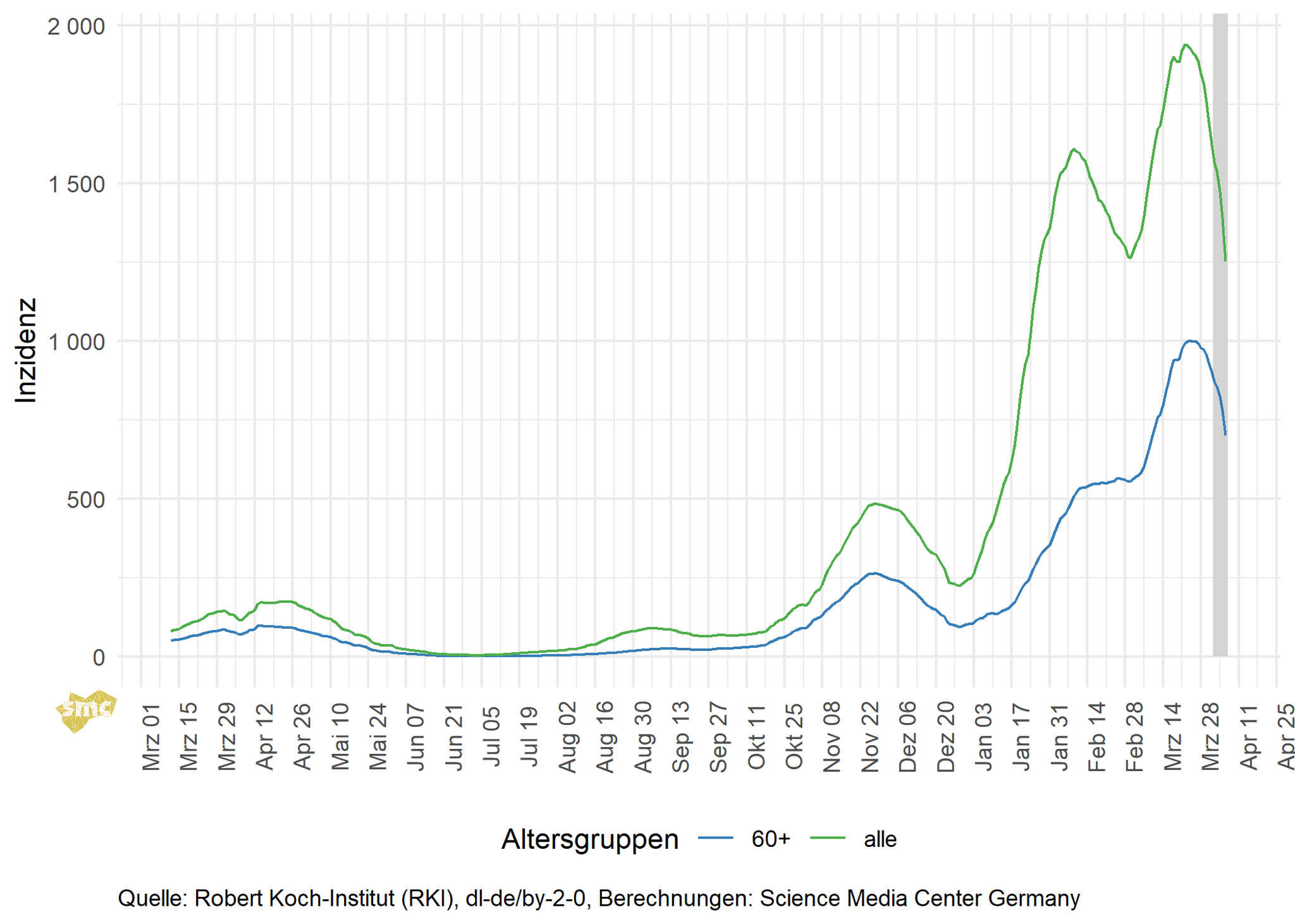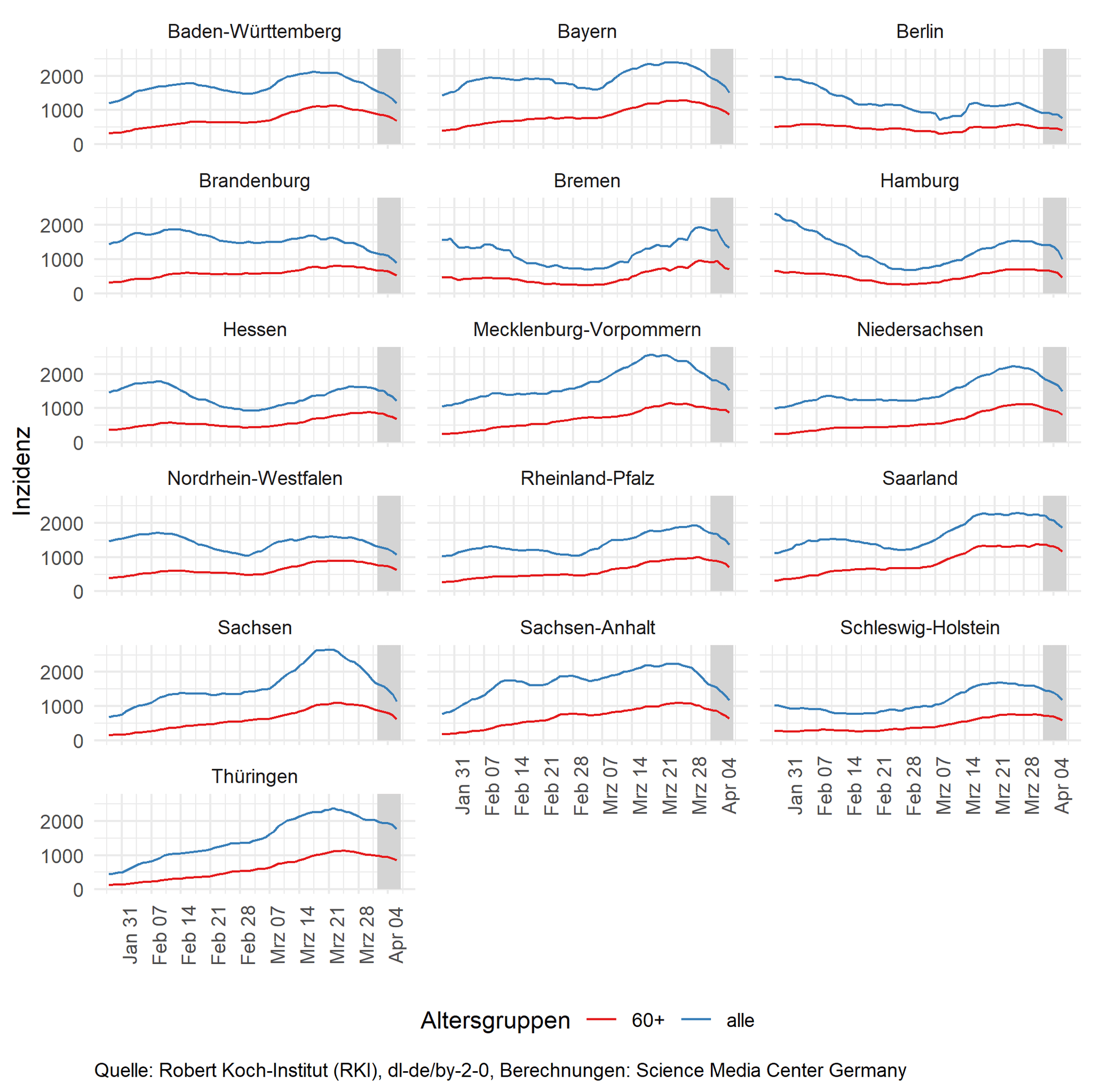 Bei den Altersgruppen ab 60 Jahren sind die Inzidenzen zuletzt stetig gestiegen. Auch hier wurde in der vergangenen Woche erstmals wieder ein Rückgang der Inzidenzen beobachtet. Da diese Altersgruppen die Lage in den Krankenhäusern am stärksten beeinflusst, kann dies zu einem deutlicheren Rückgang der Bettenbelegung in den Krankenhäusern führen, falls sich dieser Trend trotz Lockerungen fortsetzen sollte.