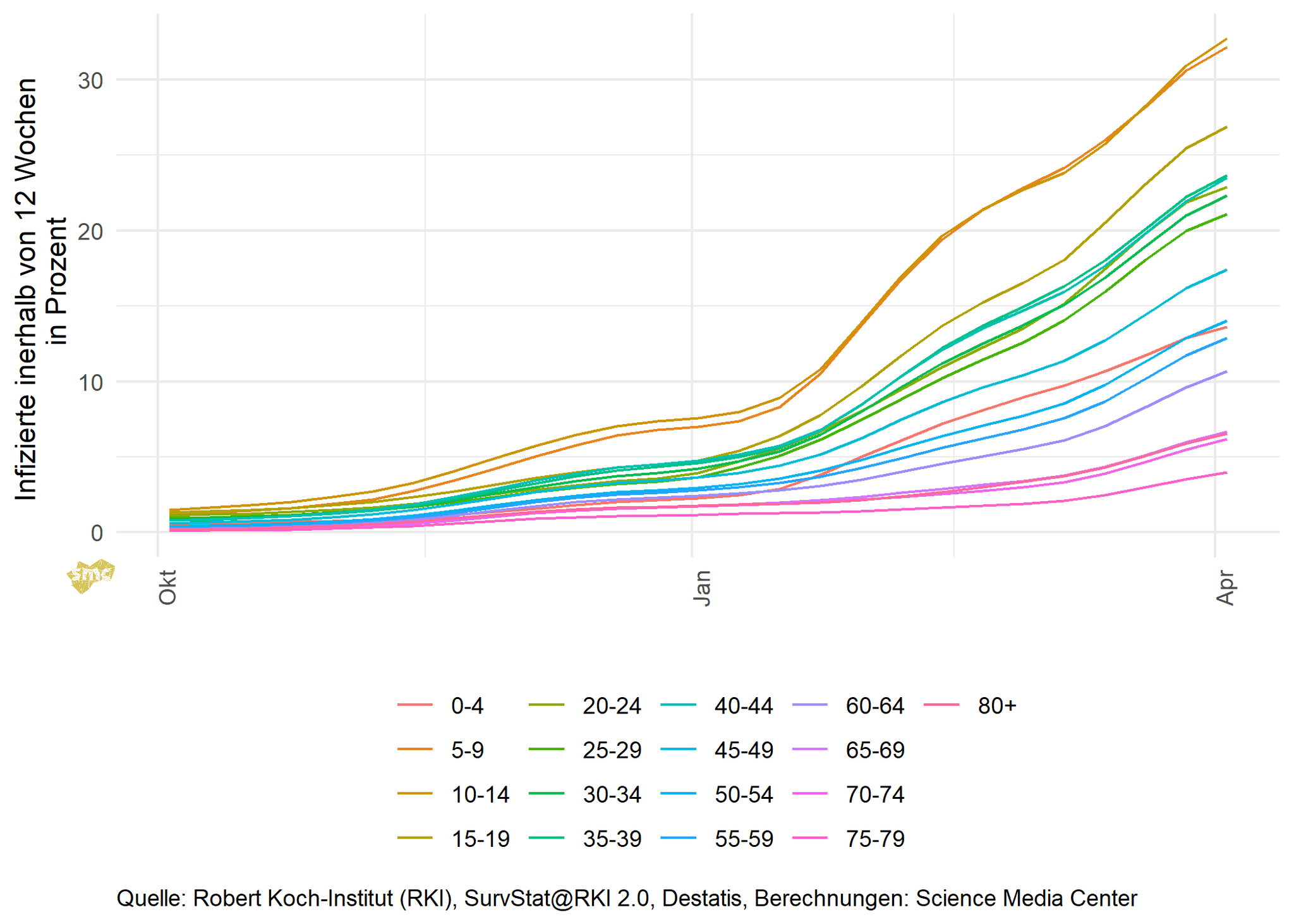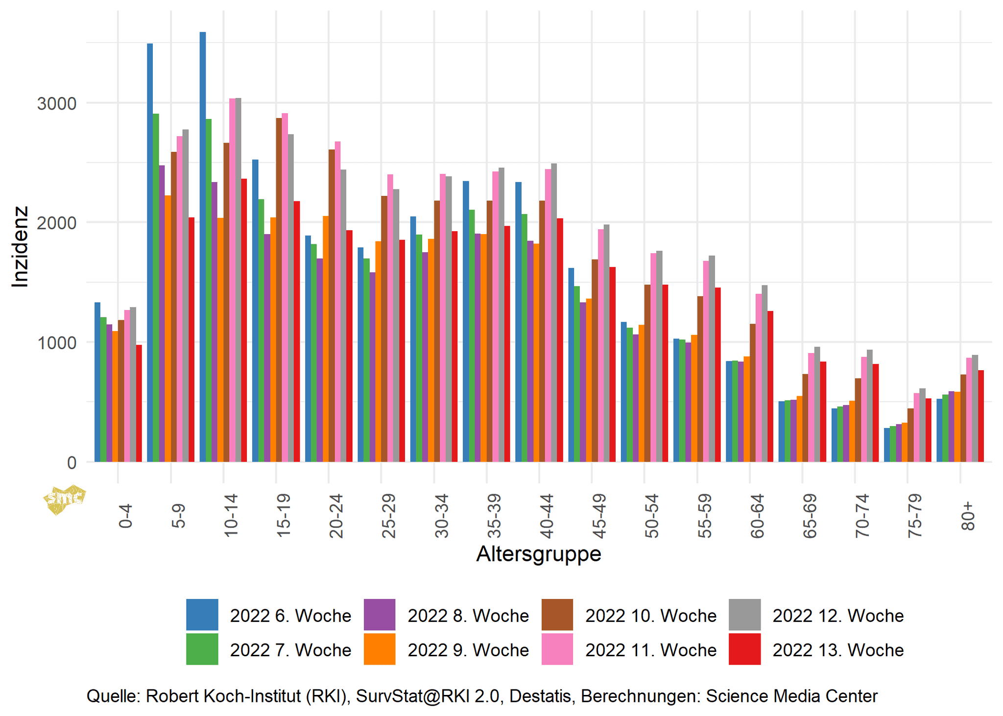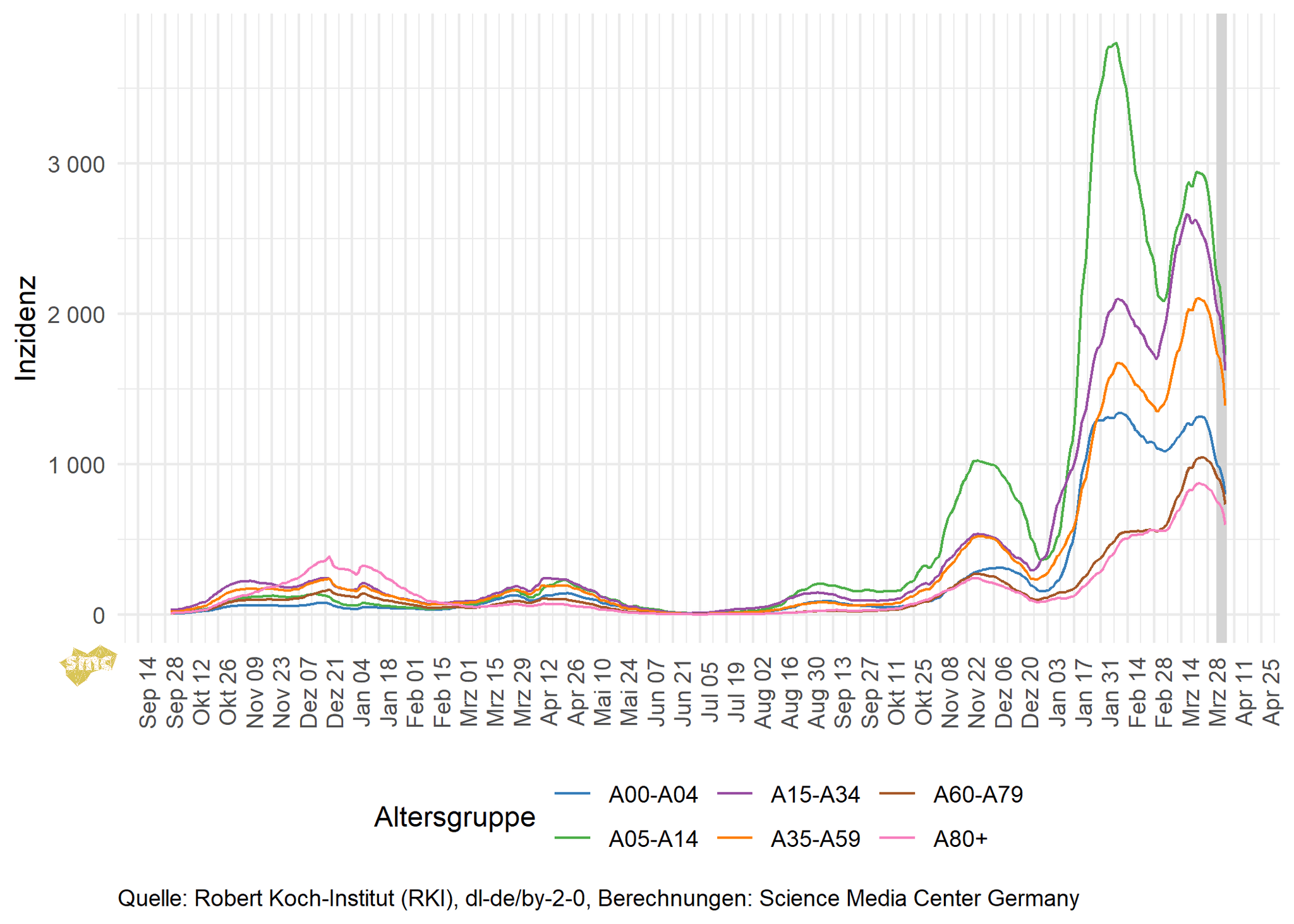 In allen Altersgruppen gehen die Inzidenzen deutlich zurück, der Rückgang in den unteren Altersgruppen ist aber stärker als in den oberen.