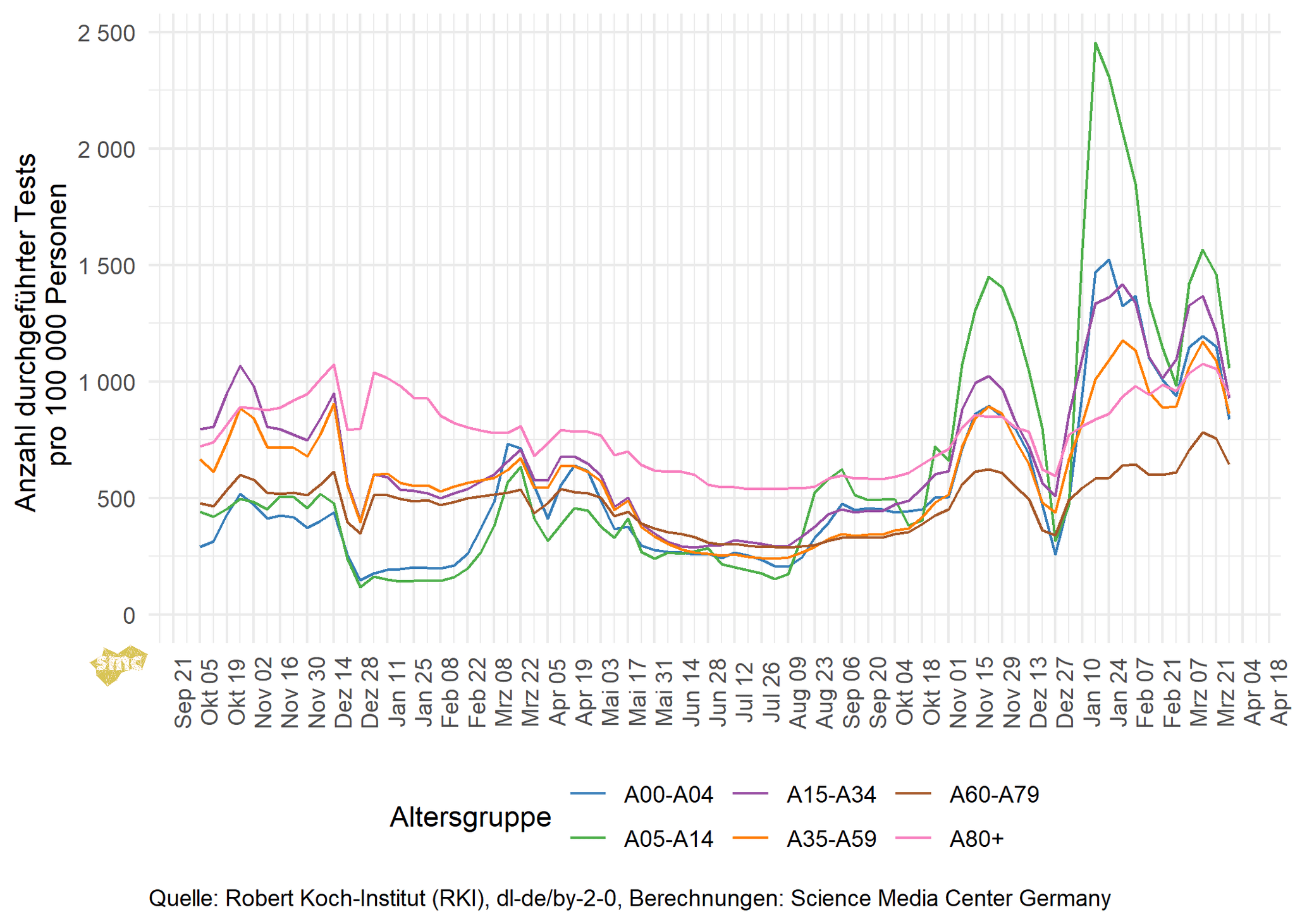 Die Testpositivrate ist in allen Altersgruppen gesunken. Auch die Zahl der durchgeführten Tests geht weiter zurück.