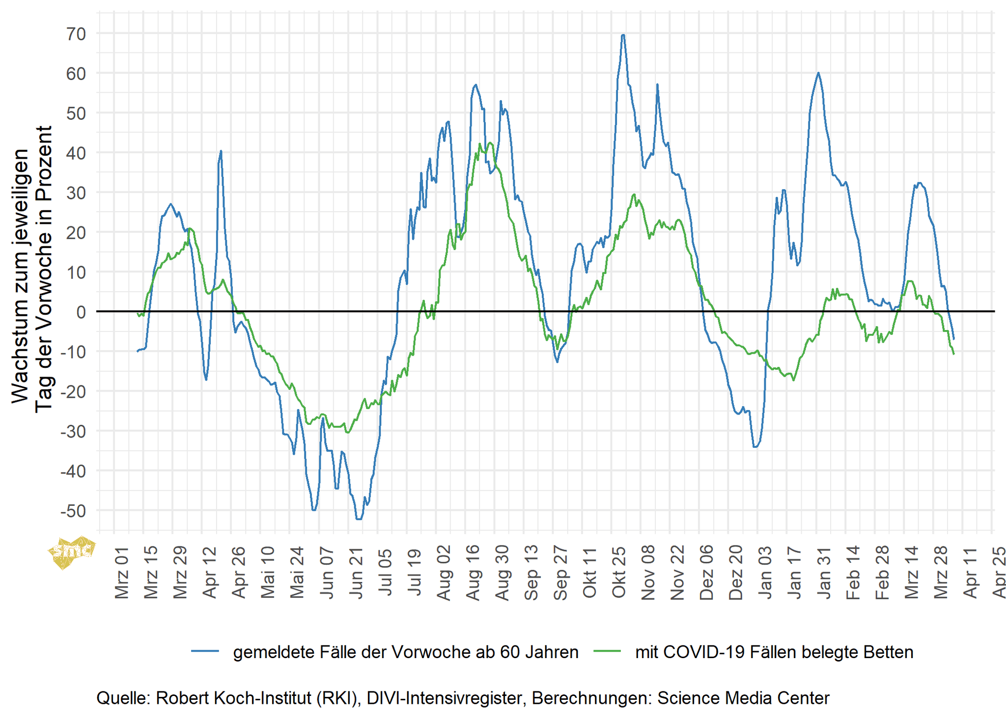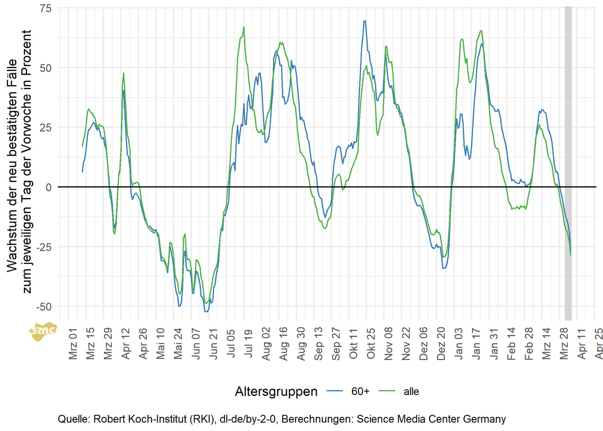 Die Grafik zeigt für jeden Tag das prozentuale Wachstum der geglätteten Fallzahlen im Vergleich zur Vorwoche. Dabei werden einmal alle gemeldeten Fälle berücksichtigt und einmal nur Fälle mit einem Alter von mindestens 60 Jahren. Der Inzidenzrückgang beschleunigt sich aktuell sowohl in der Gesamtbevölkerung als auch in der Altersgruppe ab 60 Jahren.