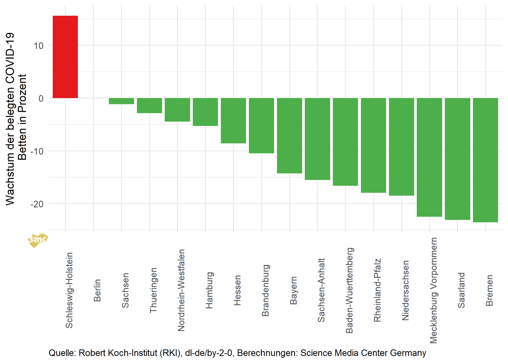In fast allen Bundesländern sinkt die Zahl der durch COVID-19-Fälle belegten Betten. Schleswig-Holstein unterliegt aufgrund der niedrigen Zahl an Intensivbetten höheren Schwankungen.