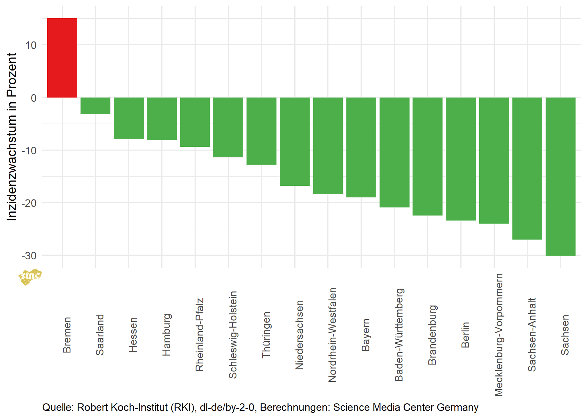 Im Folgenden wird das Wachstum der Inzidenz vom 02.04.2022 im Vergleich zur Vorwoche betrachtet. Aktuell weist nur Bremen steigende Inzidenzen auf.