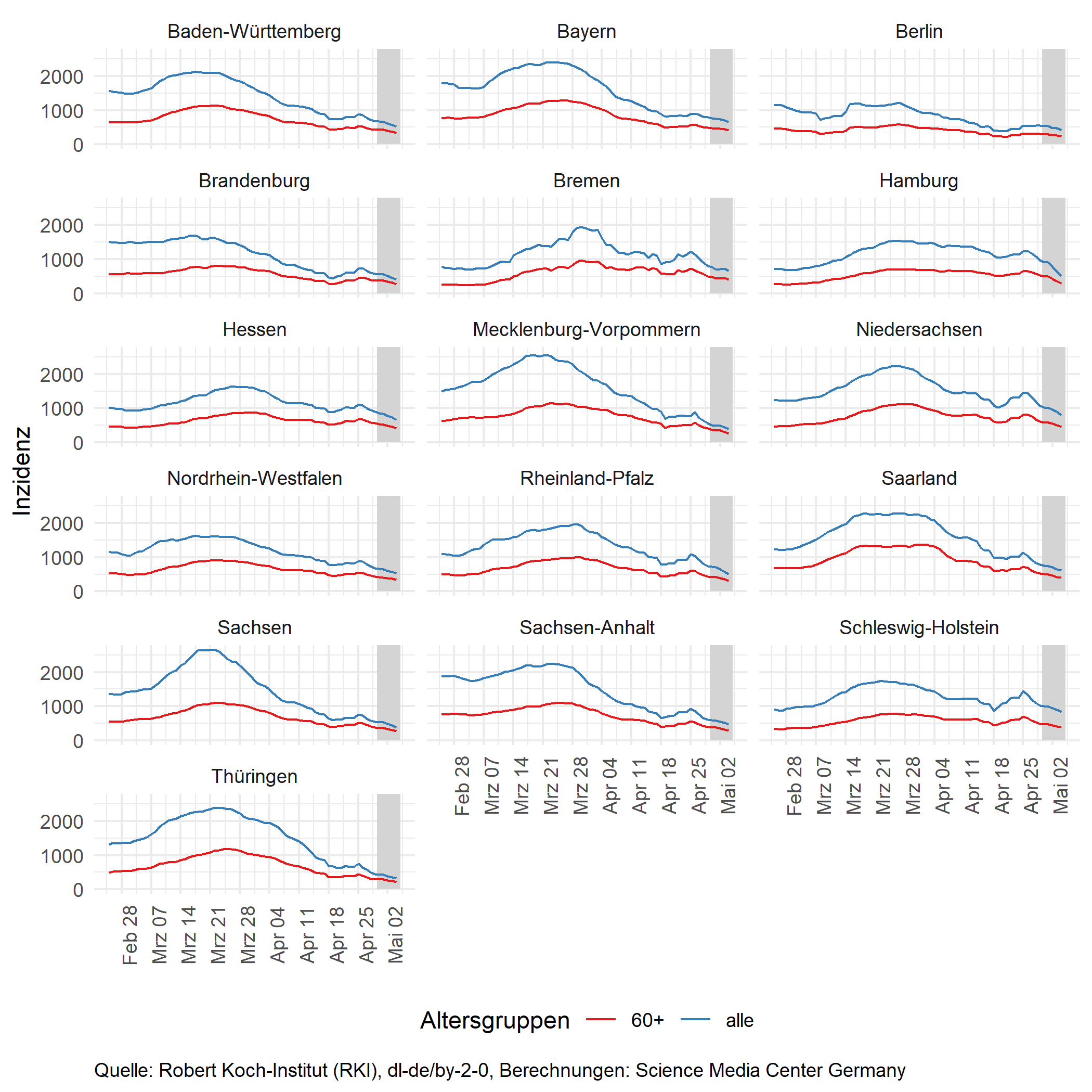 Die Grafik zeigt für jeden Tag das prozentuale Wachstum der geglätteten Fallzahlen im Vergleich zur Vorwoche. Dabei werden einmal alle gemeldeten Fälle berücksichtigt und einmal nur Fälle mit einem Alter von mindestens 60 Jahren. Das Wachstum ist aktuell eindeutig negativ. Die Inzidenzen gehen deutlich zurück.
