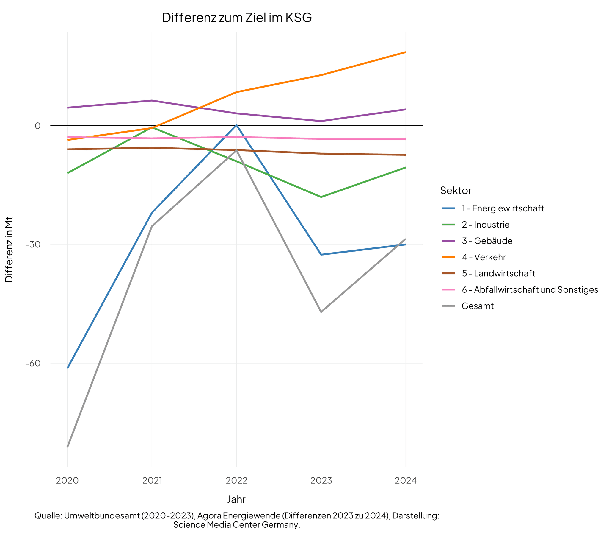 „Die Minderung der Treibhausgasemissionen im Jahr 2024 entfällt nahezu vollständig auf den massiven Rückgang in der Stromwirtschaft. In allen anderen Bereichen sind die Emissionen entweder leicht gestiegen (Industrie), nur sehr geringfügig gesunken (Verkehrssektor) oder unter Berücksichtigung der meteorologischen Bedingungen nahezu unverändert geblieben (Gebäude).“