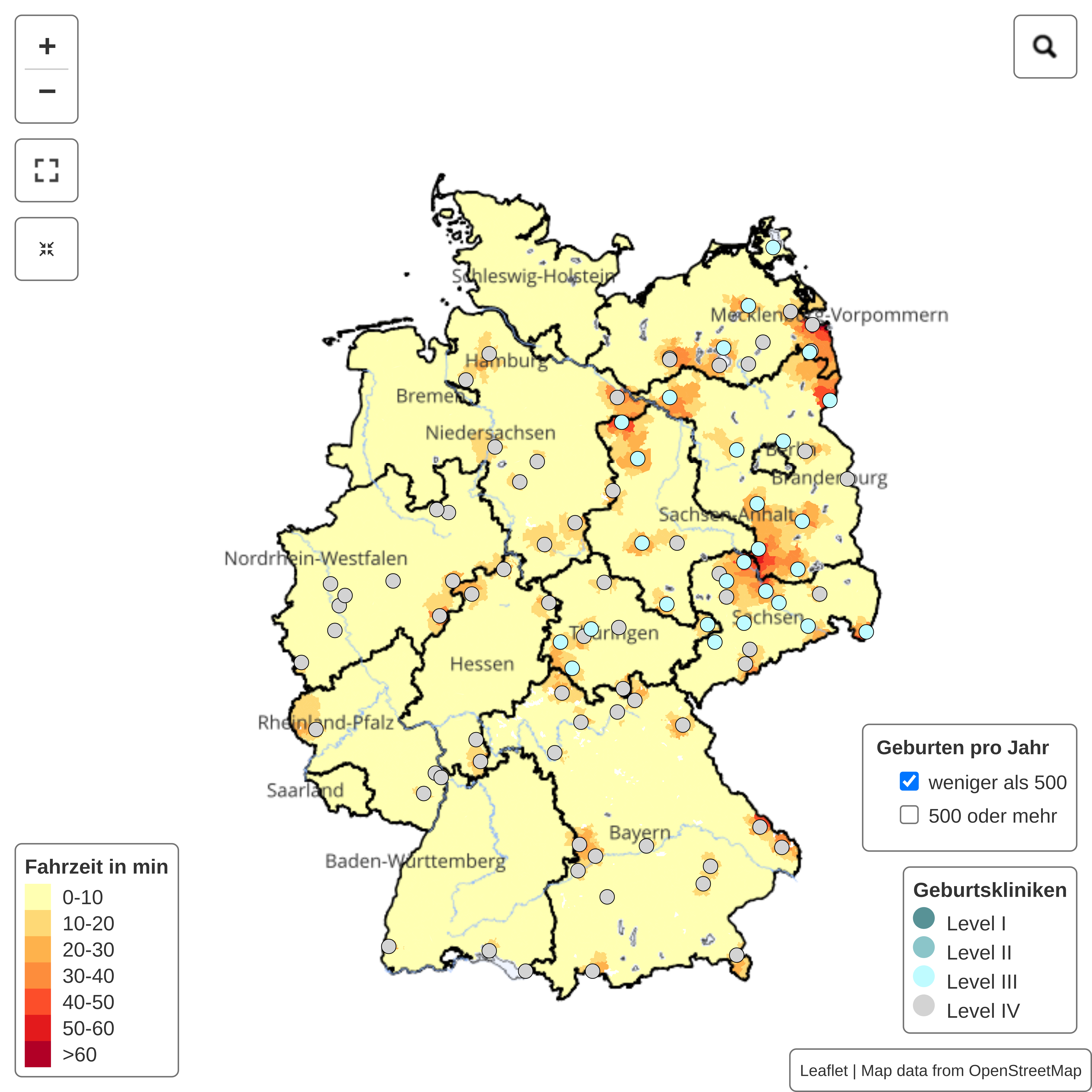 Karte II: Dargestellt sind die zusätzlichen Fahrzeiten, die entstehen würden, wenn alle Kliniken (Punkte) mit unter 500 Geburten pro Jahr nicht mehr an der Versorgung teilnehmen würden. Kliniken mit mehr als 500 Geburten pro Jahr sind zur Übersicht an- und abwählbar. Die Fahrzeitenberechnung erfolgt allerdings nicht neu. Die Geburtenzahlen sind auf dem Stand 2023.