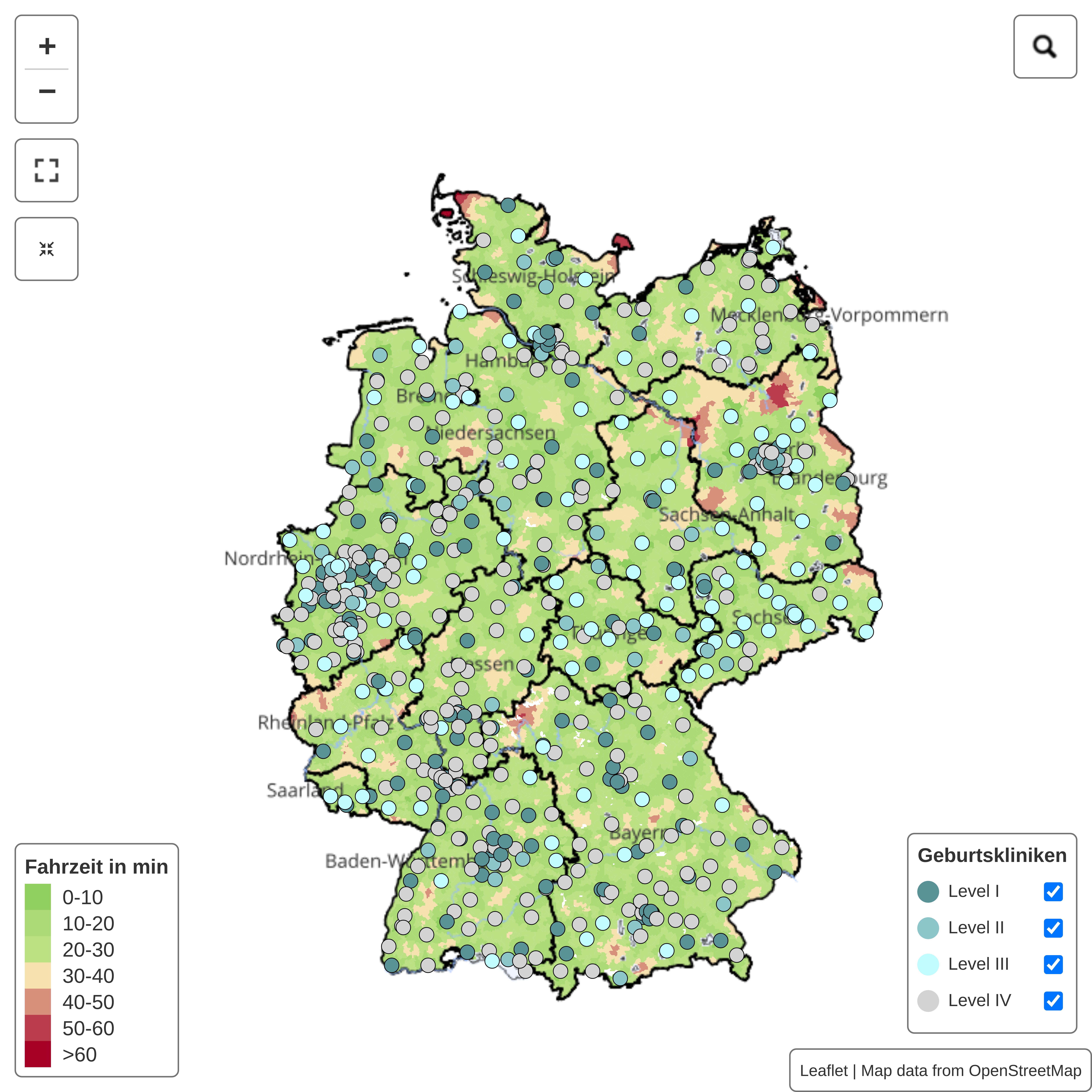 Karte I: Zu sehen sind die durchschnittlichen Fahrzeiten jeder 100-mal-100-Meter-Gitterzelle in Deutschland zur nächstgelegenen Geburtsklinik (Punkte). Zudem ist die Zahl der Einwohnerinnen im gebärfähigen Alter angegeben, die davon betroffen sind. Die verschiedenen Kliniklevel sind zur Übersicht an- und abwählbar. Die Fahrzeitenberechnung erfolgt allerdings nicht neu. Die Geburtenzahlen sind auf dem Stand 2023.
