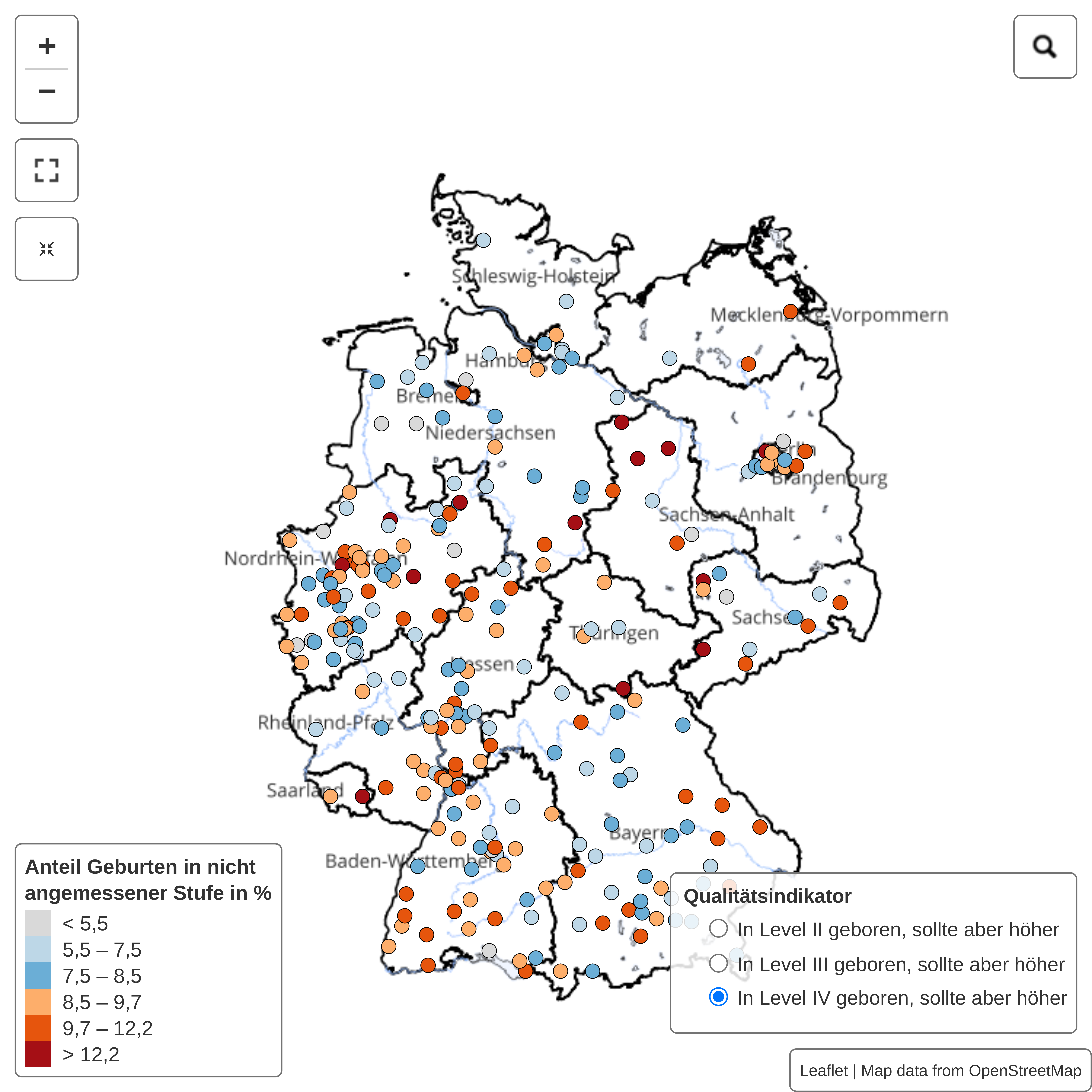 In der dezentralen, einrichtungsbezogenen Qualitätssicherung (DeQS) des IQTIG gibt es drei Qualitätsindikatoren, die den Anteil der Geburten bezogen auf die Gesamtzahl aller Geburten eines Klinikstandorts berechnet, der nicht in einem adäquaten Versorgungslevel stattgefunden hat. Diese Anteile wurden ebenfalls aus den Qualitätsberichten der Krankenhäuser ausgelesen. Der Indikator mit der ID „182014“ ermittelt beispielsweise Geburten, die in einer Level-IV-Klinik erfolgten, aber in einer höheren Versorgungsstufe hätten erfolgen müssen, also in Level I, II oder III. Analog sind die Indikatoren „182011“ (in Level III geboren) und „182010“ (in Level II geboren) definiert.