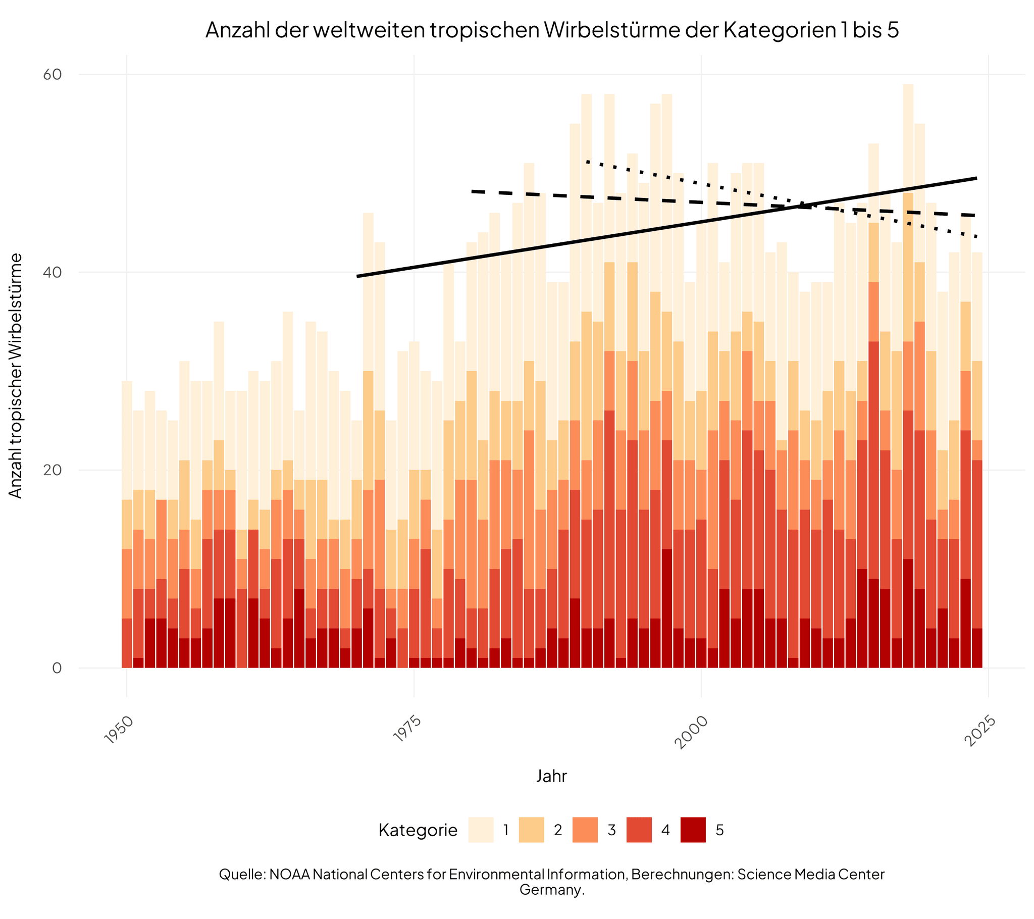 Die folgende Abbildung stellt die Anzahl tropischer Wirbelstürme global dar, berücksichtigt also Hurrikane, Zyklone und Taifune. Die Linien zeigen die statistischen Trends über verschiedene Zeiträume und machen sehr deutlich, wie enorm wichtig der Beginn des Betrachtungszeitraums ist. Die durchgezogene Linie bildet den Trend ab, wenn die Jahre 1970 bis 2024 betrachtet werden. Für die gestrichelte Linie beginnt dieser Zeitraum im Jahr 1980, bei der gepunkteten im Jahr 1990. Die systematische Beobachtung von Wirbelstürmen mit Satelliten begann in den 1960er Jahren. Seit den 1970er Jahren wurden Wettersatelliten zunehmend für die flächendeckende Überwachung tropischer Wirbelstürme eingesetzt. In den 1990er Jahren war die globale Satellitenüberwachung so weit fortgeschritten, dass seitdem verlässliche und flächendeckende Daten zur Verfügung stehen.