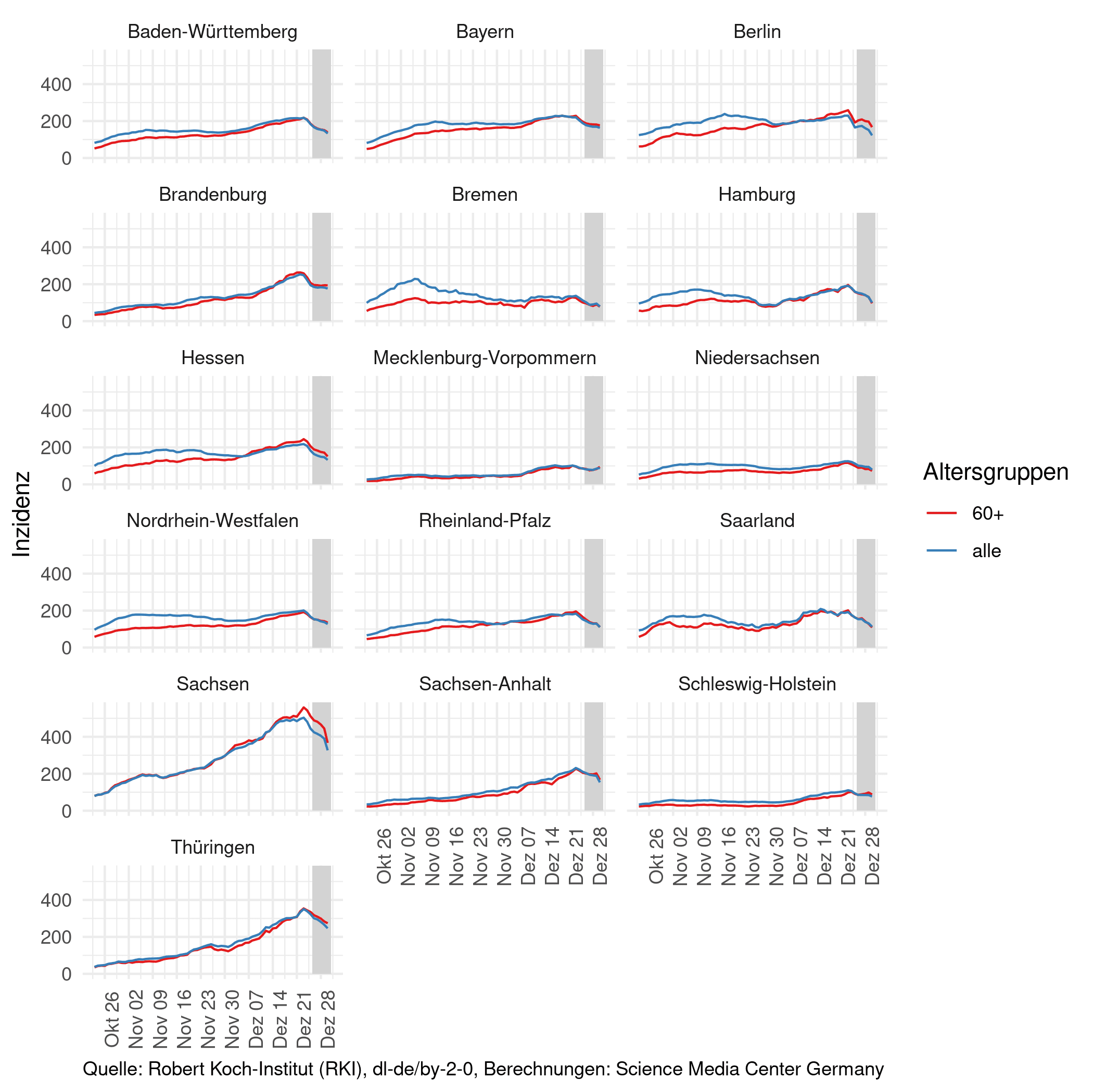 Vergleicht man die Werte vom 28. und 29. Dezember mit denen der Vorwoche (rote Linien), so nähern sie sich diesen Zahlen bereits wieder deutlich an. Dabei ist zu beachten, dass in den nächsten Tagen noch Nachmeldungen für diese Daten erfolgen werden (insbesondere im grauen Bereich), was die Tageswerte weiter erhöht. Der Wert für das letzte verfügbare Datum liegt noch deutlich zu niedrig, sodass ein Vergleich noch nicht zielführend ist. Auch wenn der Verlauf nach Meldedatum etwas stabiler ist als die Zahl der täglich in die RKI-Statistik aufgenommenen Fälle, so ist auch dieser von einem Feiertagseffekt betroffen: Tests, die über die Feiertage nicht durchgeführt wurden, werden eventuell nachgeholt und führen so zu höheren Werten an Tagen nach den Feiertagen. Da mit dem Jahreswechsel weitere Feiertage anstehen, werden die Zahlen in den kommenden Tagen weiterhin schwer zu interpretieren sein.