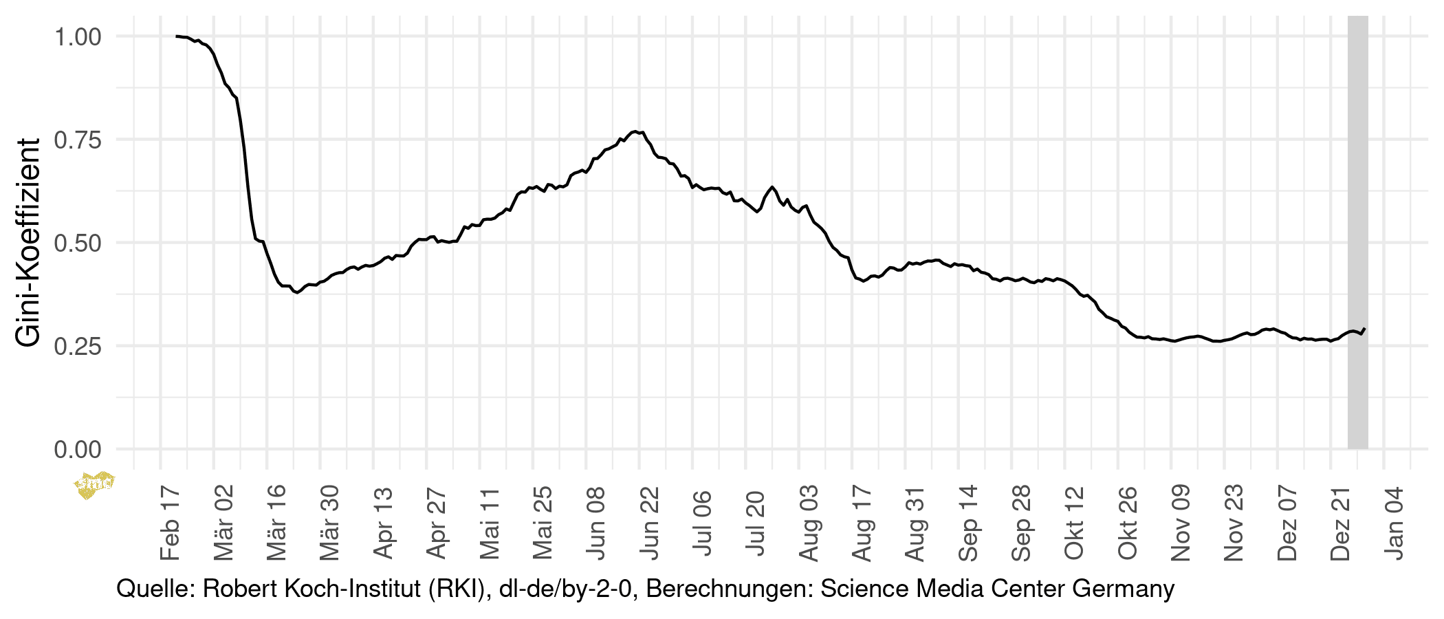 Ende Februar war die Ungleichheit bei den gemeldeten Fällen noch sehr groß, fiel dann aber mit steigender Fallzahl ab, da sich das Virus über Deutschland verteilte. Auch in den Hochzeiten waren die gemeldeten Inzidenzen nicht gleichmäßig verteilt.