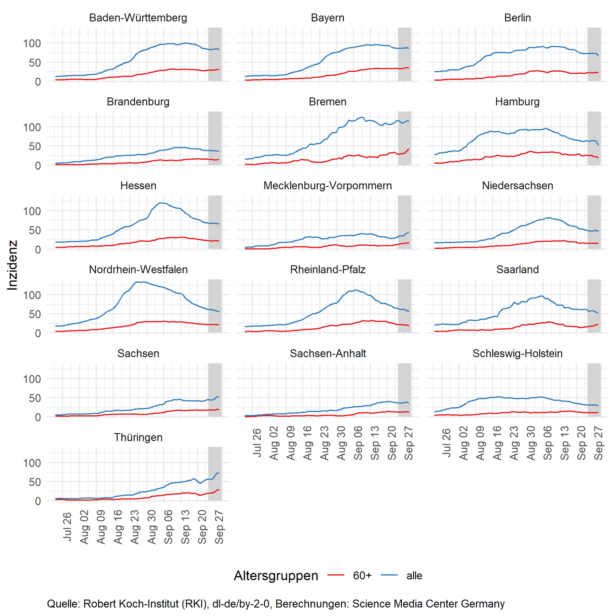 Der Trend der sinkenden Inzidenzen scheint gebrochen. Die Entwicklung der Inzidenz unterscheidet sich aber sowohl in den Altersgruppen als auch in den Bundesländern. Der Anstieg der Inzidenzen scheint verstärkt von den älteren Altersgruppen auszugehen. Die Inzidenz der ab 60-Jährigen steigt auch in einigen Bundesländern, die insgesamt noch sinkende Inzidenzen aufweisen. Bei den Bundesländern steigen insbesondere die Inzidenzen in Bremen und mehreren ostdeutschen Bundesländern, die zuletzt noch niedrige Inzidenzen ausgewiesen haben.