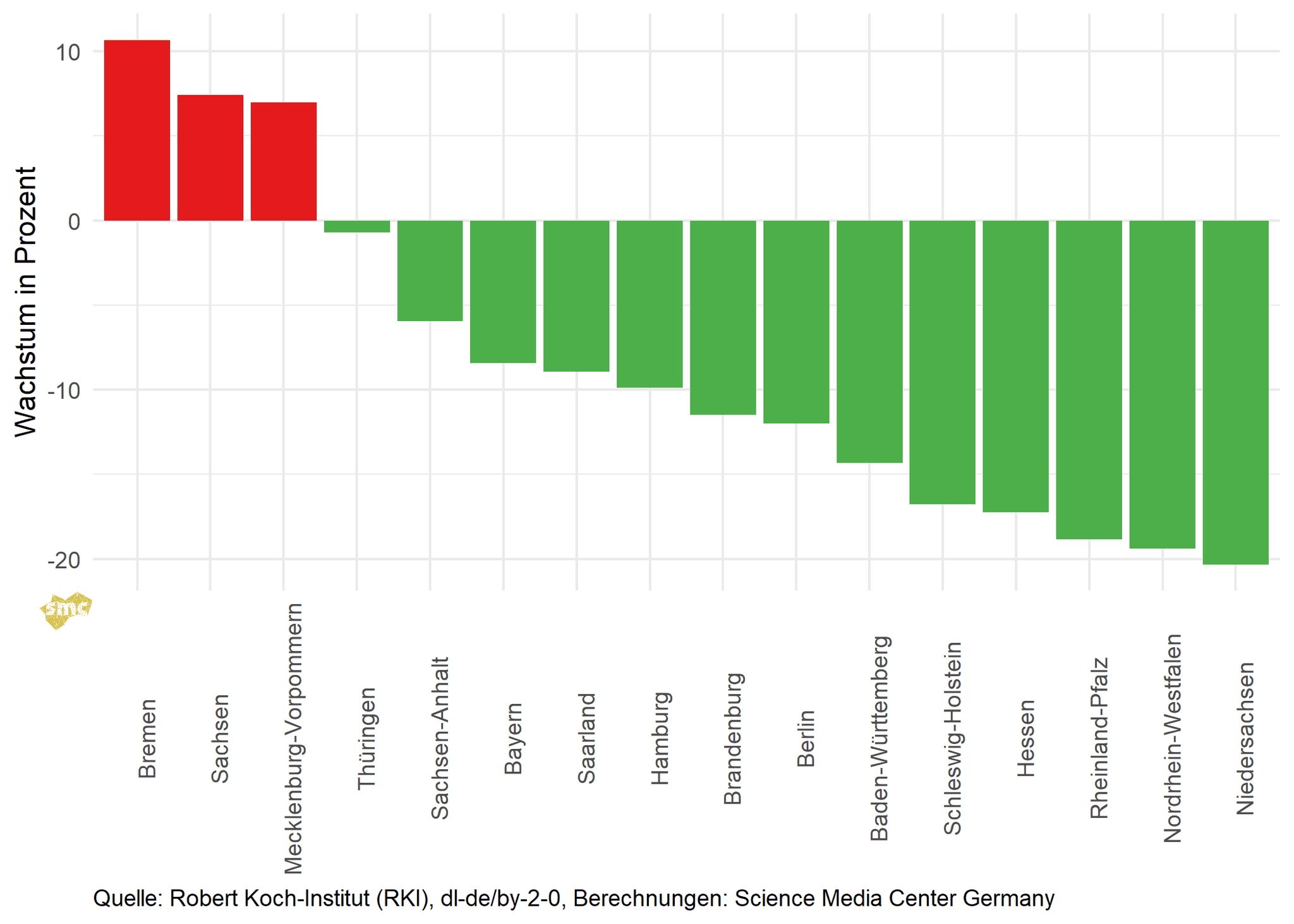 Im Folgenden wird das Wachstum der Inzidenz vom 25.09.2021 im Vergleich zur Vorwoche betrachtet. Besonders in Bremen und einigen ostdeutschen Bundesländern steigen die Inzidenzen wieder. In der jüngeren Entwicklung weist auch Sachsen steigende Inzidenzen auf.