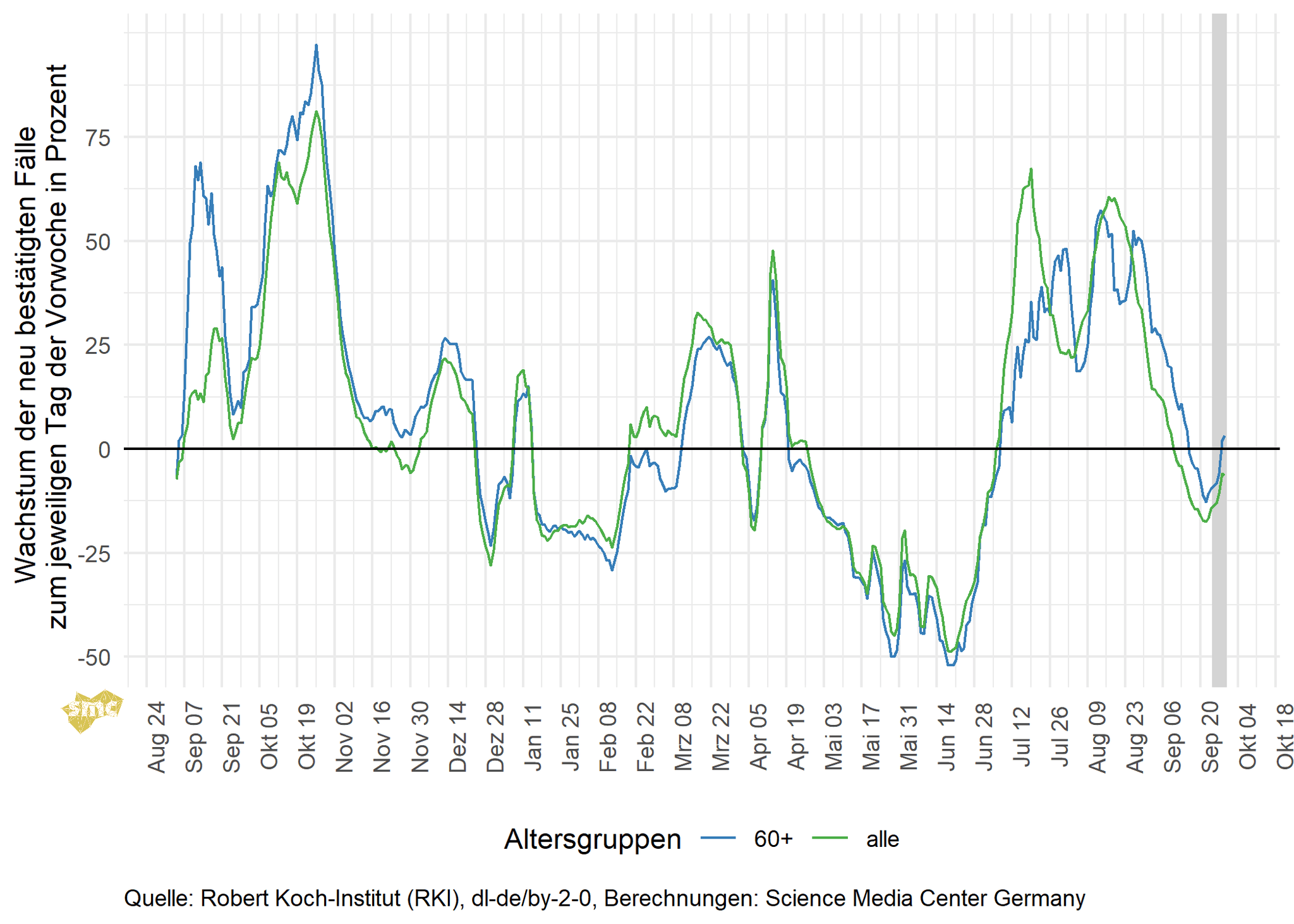 Die Grafik zeigt für jeden Tag das prozentuale Wachstum der geglätteten Fallzahlen im Vergleich zur Vorwoche. Dabei werden einmal alle gemeldeten Fälle berücksichtigt und einmal nur Fälle mit einem Alter von mindestens 60 Jahren. Beim Wachstum zeichnet sich eine Trendwende ab, insbesondere bei den über 60-Jährigen ist das Wachstum schon wieder positiv.