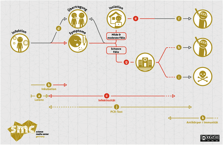 Wie lange dauert eine COVID-19-Krankheit, wann tauchen nach einer Ansteckung erste Symptome auf und wie lange sind mit SARS-CoV-2 Infizierte für Kontaktpersonen ansteckend? Vor allem: Was weiß die Wissenschaft inzwischen darüber? Der typische Verlauf der neuartigen Erkrankung ist schwierig zu bestimmen, weil sich COVID-19 sehr unterschiedlich äußert. Äußere Einflüsse, wie das Alter der Erkrankten, der Zustand des Gesundheitssystems oder die Bevölkerungsstruktur im betroffenen Land, spielen eine große Rolle. Eine grobe Abschätzung des natürlichen COVID-19-Verlaufs ist dennoch wichtig, um der Bevölkerung die Regeln zur möglichst frühen Isolation und Quarantäne zu erklären und sie in die Lage zu versetzen, sich ein Urteil zu bilden über das Infektionsgeschehen. Für Journalistinnen und Journalisten können infektionsepidemiologische Maße, wie Inkubationszeit, serielles Intervall und Infektiosität wichtige Anhaltspunkte dafür liefern, ob und wann weitere Menschen von Infizierten angesteckt werden können.