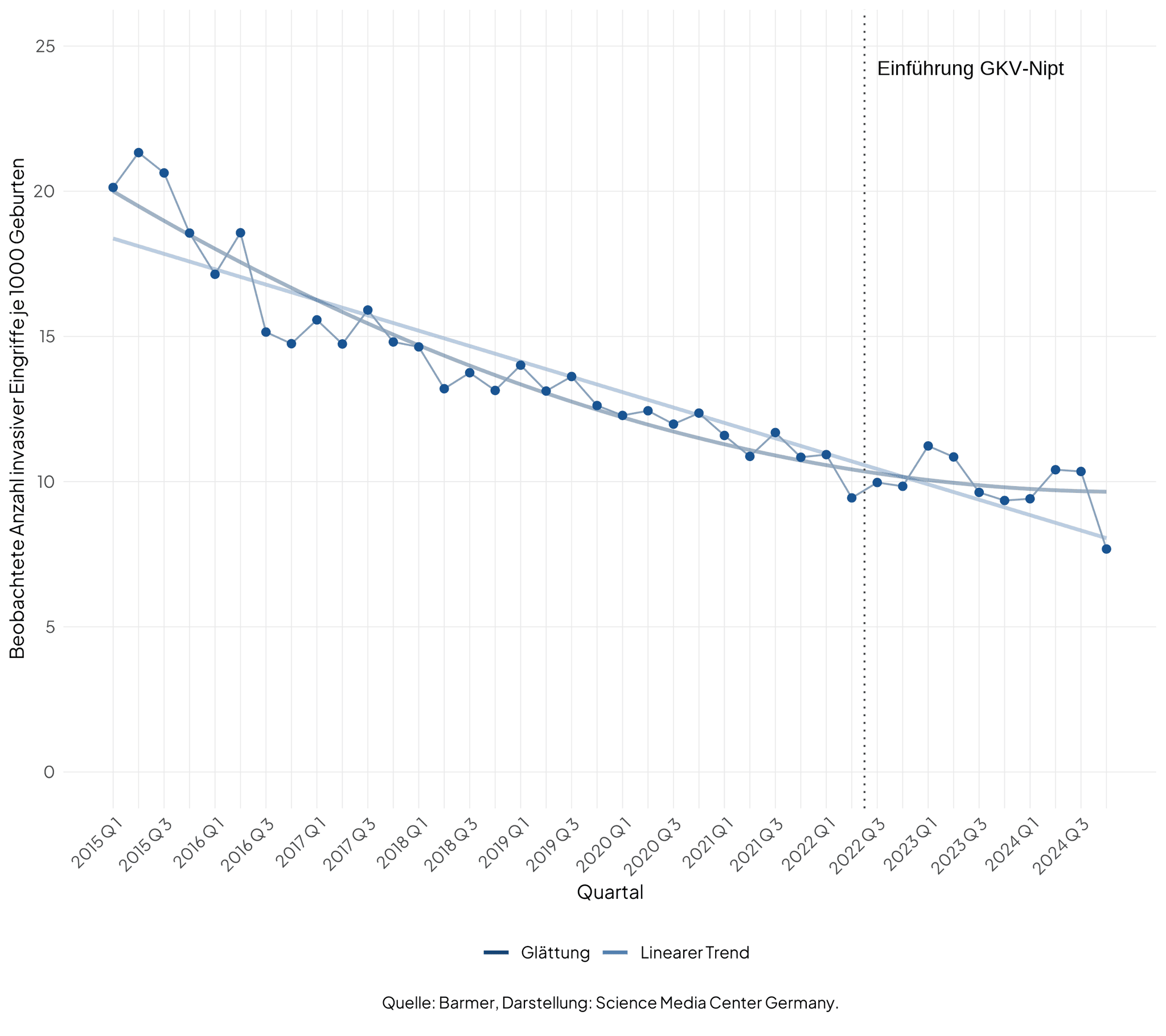 „Die Ergebnisse unserer noch nicht publizierten Auswertung der KBV-Abrechnungsdaten (drittes Quartal 2020 bis erstes Quartal 2025) zeigen dagegen keine Zunahme, sondern ratenbasiert einen leichten Rückgang invasiver pränataler Diagnostik. Die normierte Rate von Amniozentese und Chorionzottenbiopsie sank von 3,93 auf 3,55 je 1000 betreute Schwangerschaften; auch im Quartalsmittel nahm die Zahl invasiver Eingriffe von 2541 auf 2031 pro Quartal ab.“